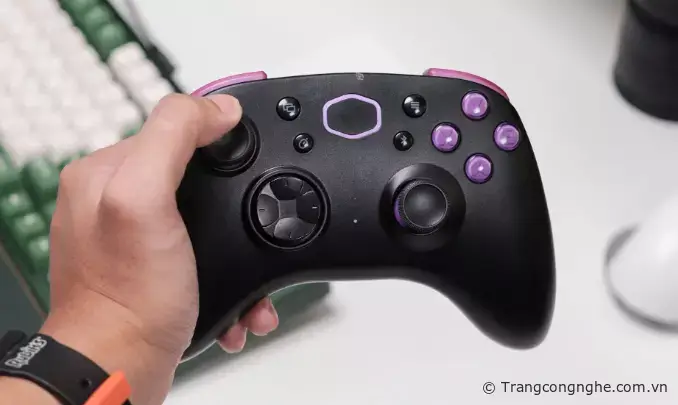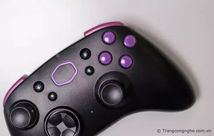 Ở phần giữa tay cầm Cooler Master Storm, có một nút mở nguồn chính. Viền của nút này được trang trí bằng đèn LED màu tím, giúp tăng thêm sự thú vị và phong cách cho ngoại hình của tay cầm. Xung quanh nút mở nguồn, bạn sẽ thấy các nút kết nối hoặc nút menu, được sử dụng để cài đặt và điều khiển khi chơi game.