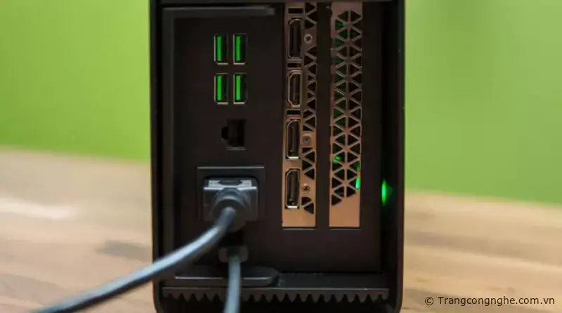 Mặt sau là nơi bố trí các cổng kết nối, chúng ta có 4 USB-A, thoái mái kết nối ra các thiết bị ngoại vi. Cổng nguồn tổng công suất 500W, nhưng Razer Core v2 chỉ hỗ trợ cho card đồ hoạ tối đa là 375W thông qua 2 nguồn 8 pin kết nối trực tiếp tới mainboard và 2 nguồn 8pin nữa kéo dài phía trên cung cấp nguồn bổ sung cho card. Công suất dư thừa còn lại dành cho các kết nối ngoại vi và để sạc luôn cho laptop với nguồn điện 60W. Vì vậy mà khi kết nối các mẫu ultrabook với razer core qua thunderbolt 3 thì laptop cũng được sạc luôn. Nhưng có điều các bạn cần chú ý là những máy sử dụng CPU hiệu năng cao thì 60W mà Razer Core cấp qua Thunderbolt 3 là không đủ, chúng ta phải cắm thêm cổng nguồn thì mới có thể tận dụng hết hiệu năng cũng như sạc cho laptop.