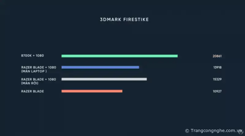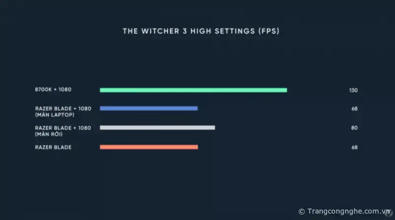 Hiệu năng của card đồ hoạ đã bị hao hụt đi nhiều do giới hạn về băng thông. Nó hao hụt nhiều đến nỗi mà ngay cả khi dùng trực tiếp chính chiếc Razer Blade (GTX 1060), hiệu năng còn ngang luôn với Razer Blade kết nối ra eGPU ngoài sử dụng GTX 1080.