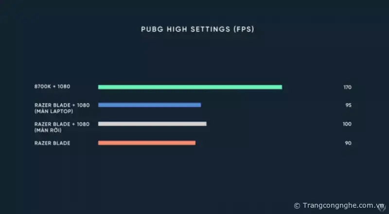 Đối với game, chơi PUBG trên Desktop FPS đạt tận 170, trong cắm Razer Blade vào eGPU chỉ còn 95fps, gắn thêm màn hình ngoài thì lên tăng thêm chút khoảng 100fps.
