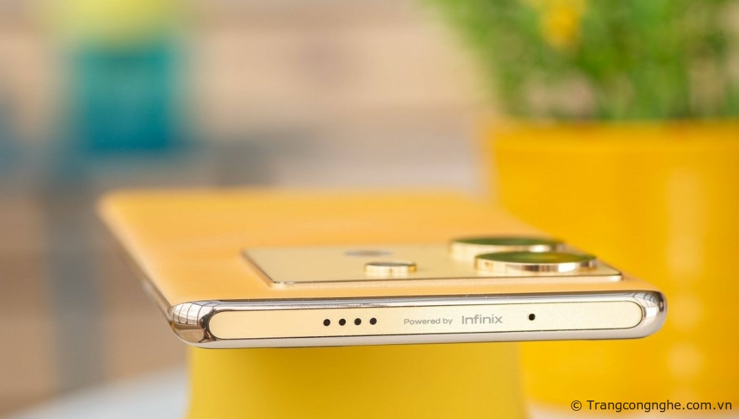 Một chi tiết đáng chú ý ở khung viền cạnh trên của điện thoại là một miếng nhựa phẳng, được hoàn thiện nhám nhằm tạo điểm nhấn trong thiết kế. Thường thì với các thiết bị sử dụng khung kim loại, vị trí này được sử dụng để đặt anten, nhưng trong trường hợp của Infinix Zero 30 5G với khung nhựa, việc này không còn cần thiết và có thể được xem là một chi tiết trang trí thêm vào để làm cho thiết kế trở nên độc đáo và thu hút.