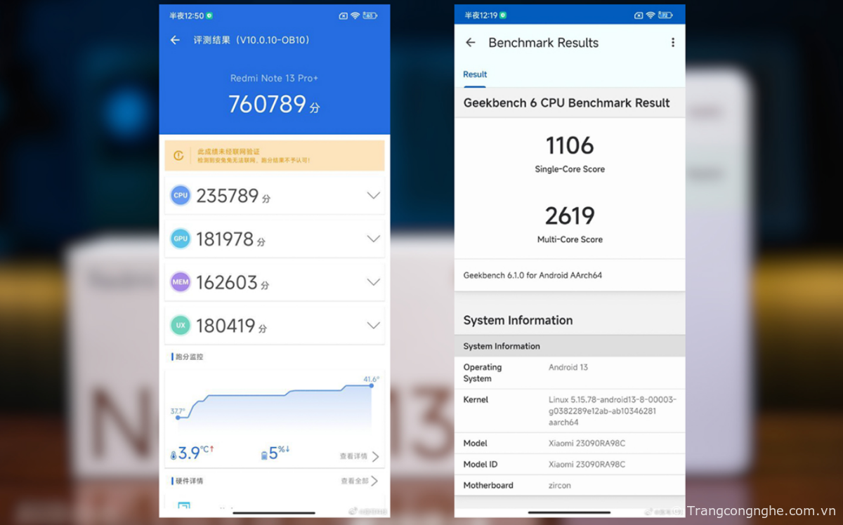 Điểm hiệu năng của Redmi Note 13 Pro+ với 760,789 điểm Antutu và 1,106 điểm đơn nhân, 2,619 điểm đa nhân khi đo bằng Geekbench 6 thể hiện rằng thiết bị này có hiệu suất cao trong phân khúc giá từ 6 triệu đồng. Điểm số này cho thấy Redmi Note 13 Pro+ có khả năng xử lý tác vụ mạnh mẽ và đáng tin cậy, đáp ứng tốt các yêu cầu của người dùng.
