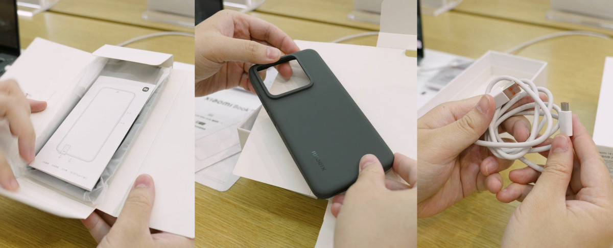 Mở hộp Xiaomi 14, ngoài điện thoại, nhà sản xuất sẽ cung cấp thêm một chiếc que chọc sim, phiếu bảo hành và hướng dẫn sử dụng, ngoài ra hãng còn cẩn thận tặng thêm cho người mua một chiếc ốp silicon bảo vệ cho máy.