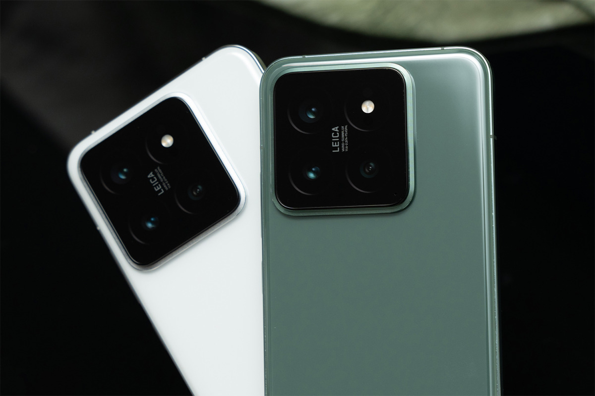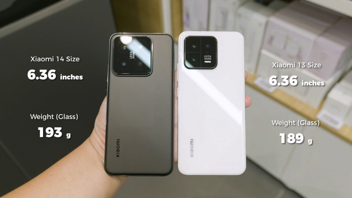 Xiaomi 14 và Xiaomi 14 Pro có chung một ngôn ngữ thiết kế mặt lưng phẳng với các cạnh bo nhẹ. Khi so sánh với Xiaomi 13, có thể thấy hai thế hệ không có nhiều thay đổi trong thiết kế, chỉ khác nhau về kích thước cụm camera Leica ở mặt lưng được làm lớn hơn ở Xiaomi 14.