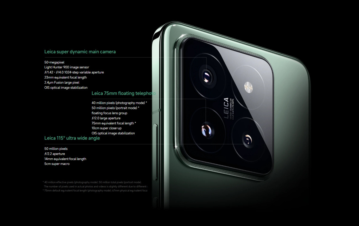 Kích thước điểm ảnh của cảm biến mới trên Xiaomi 14 là 2.4μm, kích thước cảm biến ảnh là 1/1.31-inch. Điều đáng nói là cảm biến Hunter 900 của Xiaomi 14 và Xiaomi 14 Pro là cảm biến được tùy chỉnh bởi chính Xiaomi, cho khả năng cải thiện dải nhạy sáng tốt hơn cảm biến IMX989 của Sony.