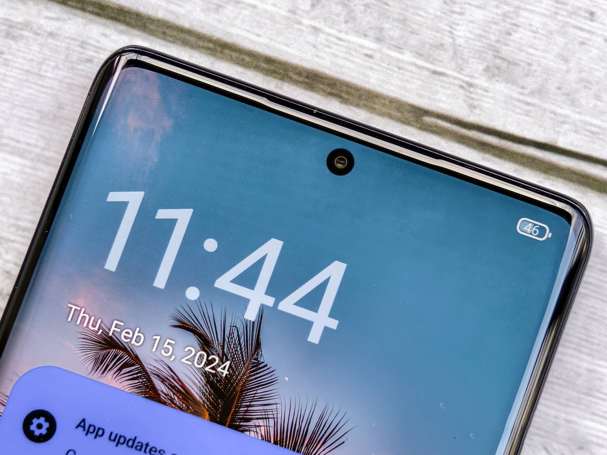 Có một lỗ khoét nhỏ giữa màn hình cho camera selfie 32MP, nhưng nếu để ý kỹ có thể thấy cảm biến bị đặt hơi lệch sang phải một chút so với các cạnh viền của camera này.