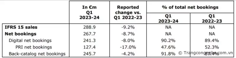 Trong quý đầu tiên của năm tài chính 2024, Ubisoft đã ghi nhận doanh thu 288,9 triệu euro, giảm 9,2% so với cùng kỳ năm trước. Tuy nhiên, đầu tư định kỳ của người chơi (bao gồm mua hàng trong trò chơi, DLC, đăng ký, vé theo mùa và quảng cáo) vẫn chiếm 47,6% tổng số lượt đặt trước. Gần 92% số lượt đặt trước đến từ các trò chơi theo IP. Trong quý thứ hai, Ubisoft dự kiến lượng đặt trước sẽ đạt 350 triệu euro. Mặc dù có sự giảm sản lượng, Ubisoft vẫn tin tưởng vào các IP nổi tiếng của mình và các trò chơi di động đang được phát triển và hy vọng sẽ đạt được thành công trong tương lai.