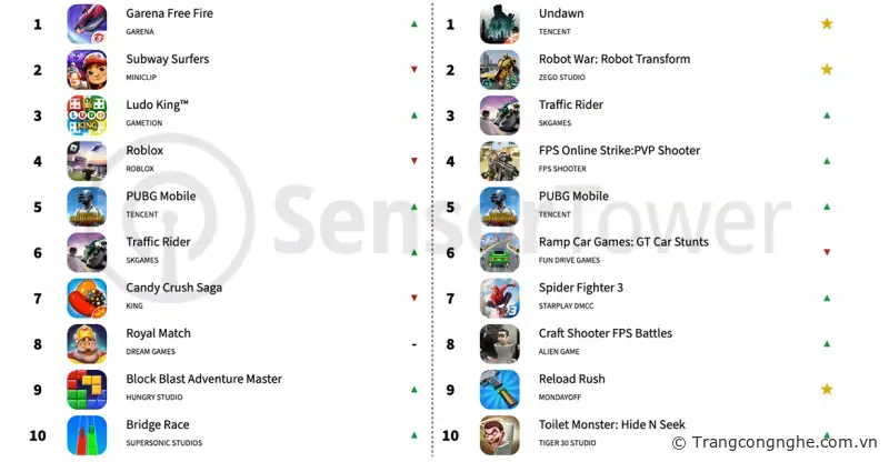 Theo Sensor Tower, danh sách các trò chơi di động được tải xuống nhiều nhất trên toàn thế giới trong tháng 6 đã mang đến sự bất ngờ cho nhiều người. Trong đó, "Free Fire" của Garena đứng đầu danh sách, với hơn 19 triệu lượt tải xuống, và "Subway Surfers" của Miniclip ở vị trí thứ hai. Ba trò chơi khác trong top 5 bao gồm "Ludo King" của Gametion, "Roblox" và "PUBG Mobile" của Tencent.