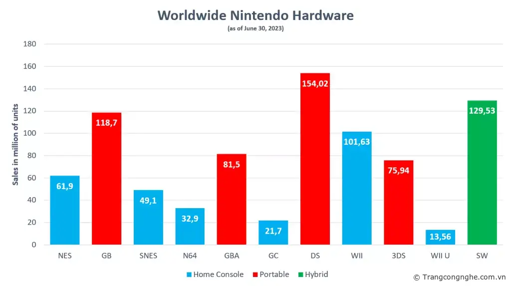 Trong quý II vừa qua, Nintendo đã bán ra thị trường thêm 3.91 triệu máy Switch, cao hơn so với con số 3.43 triệu máy bán ra trong quý I. Riêng doanh thu từ máy Switch đạt 2.9 tỷ USD, tăng 45% so với quý II năm 2022. Tổng cộng, từ khi ra mắt đến thời điểm hiện tại, Nintendo Switch đã đạt doanh số 129.53 triệu máy trên toàn cầu, trở thành chiếc máy game bán chạy thứ nhì lịch sử Nintendo, sau chiếc máy hai màn hình bỏ túi DS. Trong quý II, Switch OLED bán được 2.83 triệu máy, tương đương với 72% tổng số máy bán ra, Switch V2 đạt 650 nghìn máy (chiếm 17%), và Switch Lite đạt 430 nghìn máy (chiếm 11%).
