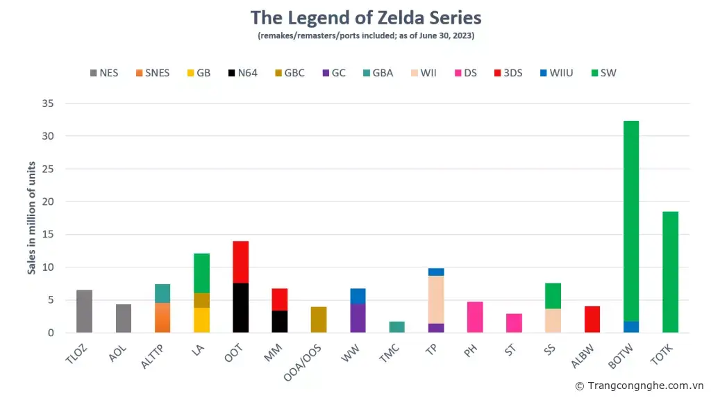 Trong buổi công bố báo cáo tài chính lần này, Nintendo đã đưa ra một số con số gây choáng váng. Đáng chú ý nhất là doanh số của tựa game The Legend of Zelda: Tears of the Kingdom. Tính đến ngày 30/6/2023, tựa game này mới chỉ phát hành được hơn một tháng. Tuy nhiên, chỉ trong vỏn vẹn 7 tuần, Tears of the Kingdom đã bán được tới 18.5 triệu bản. Con số này vượt xa cả phiên bản The Legend of Zelda bán chạy nhất lịch sử, cũng như phiên bản trước đó là Breath of the Wild, với doanh số tính đến thời điểm hiện tại là khoảng 32.35 triệu bản (bao gồm cả bản Switch và bản Wii U).