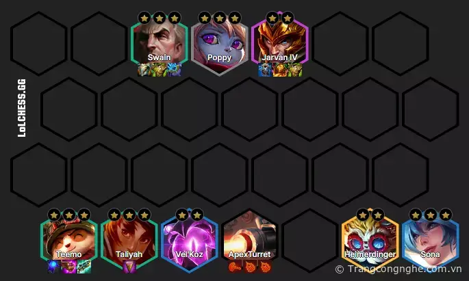 Đối với Teemo 4 sao và Taliyah, bạn có thể sử dụng Bùa Xanh, Găng Bảo Thạch, Diệt Khổng Lồ và Kiếm Súng Hextech. Chèn Sức Mạnh cũng là một lựa chọn tốt để tăng sức mạnh cho cả hai tướng này. Đối với Swain, bạn có thể trang bị Nỏ Sét, Giáp Máu và Thú Tượng Thạch Giáp hoặc các trang bị chống chịu khác.