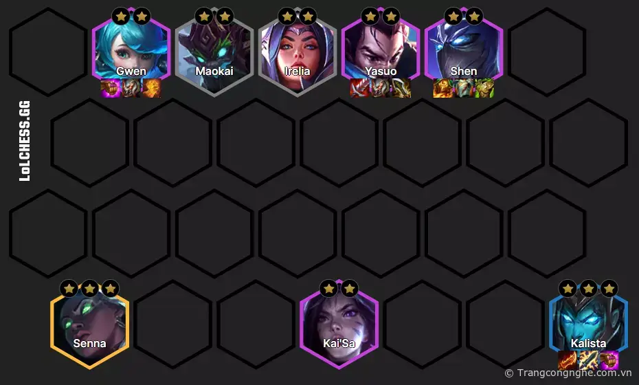 Đội hình tốt nhất để Kalista trở thành carry chắc chắn sẽ kết hợp hai tộc hệ chính của cô ấy là Quần Đảo Bóng Đêm và Thách Đấu. Khung bài tốt nhất sẽ bao gồm 4 Quần Đảo Bóng Đêm là Maokai, Kalista, Gwen và Senna, cùng với 4 Thách Đấu là Irelia, Kai'Sa và Yasuo. Để tăng khả năng chống chịu của đội hình, ưu tiên kẹp Shen để kích hoạt Ionia và Can Trường.