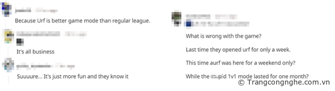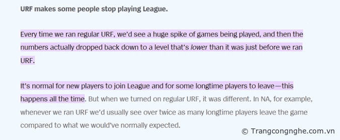 "Việc một người chơi LMHT lâu năm bỏ game là điều thường xảy ra. Tuy nhiên, có một số người chơi yêu thích chế độ URF và sau đó bỏ game khi chế độ này kết thúc, số lượng này gấp đôi (ở khu vực Bắc Mỹ). Điều này vượt quá sự mong đợi của chúng tôi..."