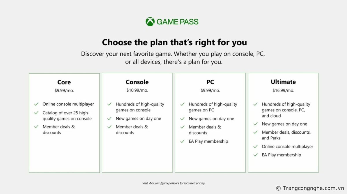 Xbox Game Pass hiện cung cấp bốn tùy chọn khác nhau cho người dùng: Xbox Game Pass Core ($10/tháng hoặc $60/năm), Xbox Game Pass ($11/tháng), PC Game Pass ($10/tháng) và Xbox Game Pass Ultimate ($17) /tháng).