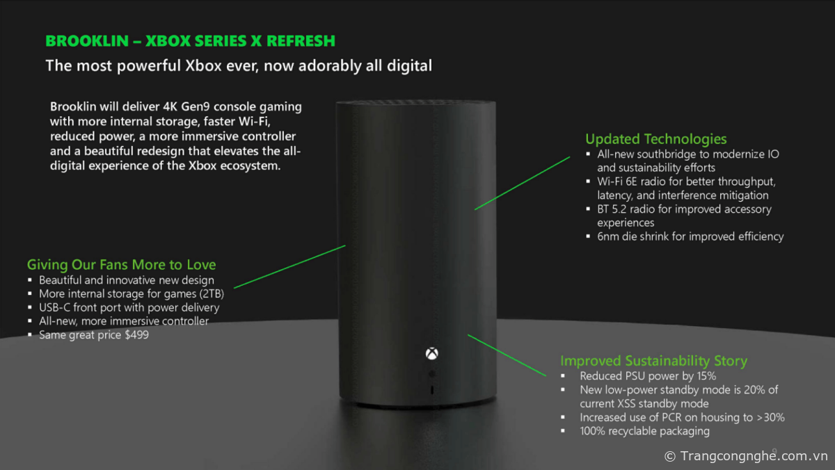 Ở bên trong, Xbox Series X mới được Microsoft bổ sung kết nối Wifi 6E, Bluetooth 5.2. Theo tài liệu của Microsoft, kích cỡ nguồn điện của PSU sẽ giảm 15%. Mức giá khởi điểm dự kiến là 499 USD tương tự Xbox Series X hiện tại.