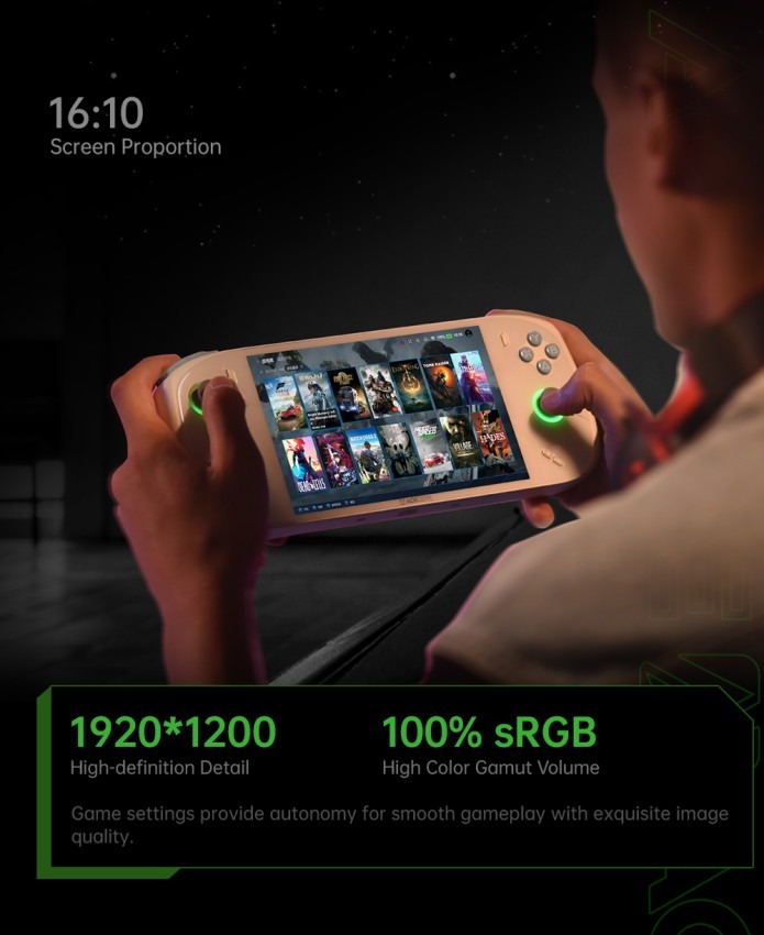 Máy chơi game cầm tay Aokzoe A2 có kích thước 265mm x 105mm x 22mm và nặng 666g, mang lại tính di động cao cho game thủ. Ở mặt trước là màn hình trung tâm với kích thước 7 inch sử dụng tấm nền IPS độ phân giải Full HD (1920 x 1200), tỷ lệ khung hình 16:10 và mật độ điểm ảnh 323 ppi, nó cũng đạt độ bao phủ 100% phổ màu sRGB.