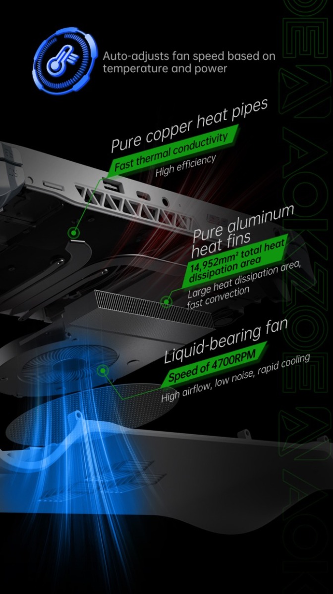 Để làm mát, thiết bị sử dụng quạt hướng trục chất lỏng cấp PC, kết hợp với ống dẫn nhiệt kép bằng đồng nguyên chất và các cánh tản nhiệt bằng nhôm nguyên chất. Nó cũng có tính năng kiểm soát nhiệt độ thông minh để quản lý nhiệt hiệu quả trong các phiên chơi game.