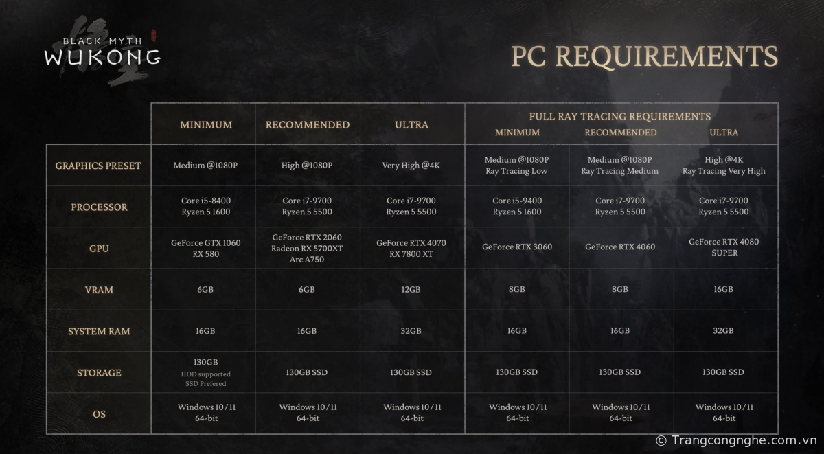 Đã lâu không có tựa game nào thách thức được giới hạn của phần cứng như Black Myth: Wukong. Dựa trên cốt truyện Tây Du Ký bất hủ, trò chơi đưa người chơi vào vai vị vua khỉ huyền thoại Tôn Ngộ Không với chi tiết đồ họa tuyệt đẹp và gameplay ra đòn hấp dẫn. Tuy nhiên, để game thủ có thể trải nghiệm trọn vẹn trò chơi thì cấu hình tối thiểu của nó đã khiến cho những máy tính mạnh nhất cũng phải chào thua.