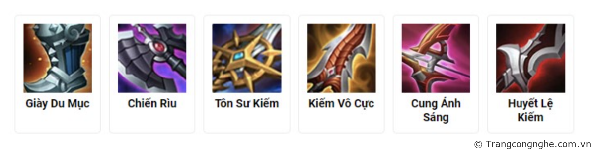 Trang bị đề xuất: Giày Du Mục + Chiến Rìu + Tôn Sư Kiếm + Kiếm Vô Cực + Cung Ánh Sáng + Huyết Lệ Kiếm