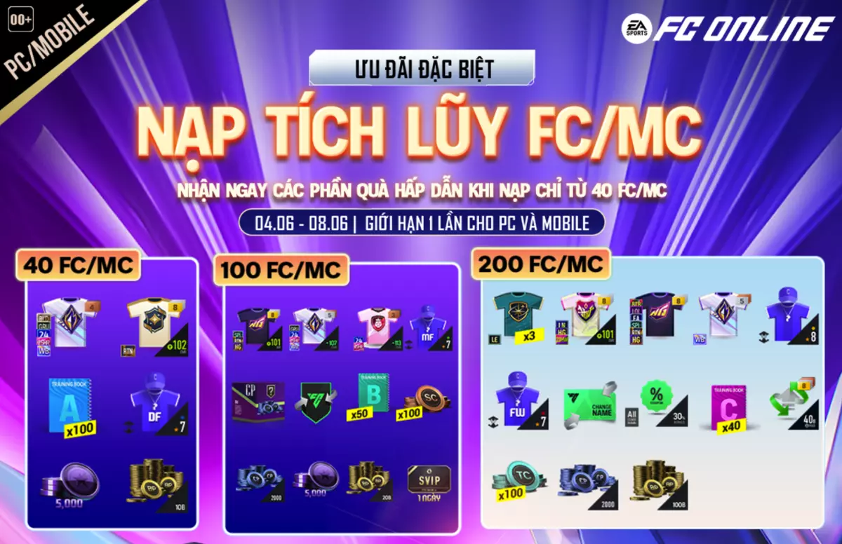 Từ 14h00 ngày 04.06.2025 đến 23h59 ngày 08.06.2025, FC Online tổ chức sự kiện Nạp Tích Lũy FC/MC, mang đến cơ hội sở hữu các cầu thủ Legend Of Europa cùng nhiều vật phẩm giá trị. Các HLV có thể tham gia nạp FC (trên PC) hoặc MC (trên Mobile) qua các kênh sau: