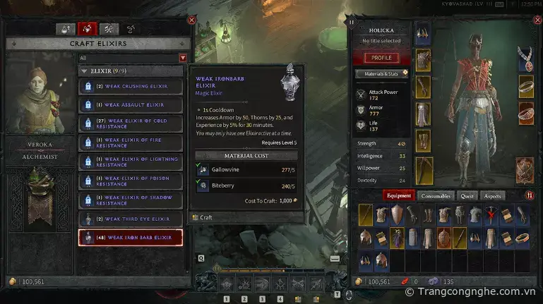 Việc kiếm Elixir có thể khá khó khăn trong Diablo IV, tuy nhiên, game thủ có thể tự điều chế chúng bằng cách thu thập các loại thảo dược hoặc hoàn thành các nhiệm vụ phụ trong quá trình thám hiểm. Khi bạn đã thu thập đủ các nguyên liệu cần thiết, hãy đến gặp Herbalist (nhà thảo dược học) tại thành phố để điều chế Elixir. Điều này cho phép bạn tận dụng tối đa các tài nguyên có sẵn và tự tạo ra những bình thuốc quý giá để sử dụng trong cuộc phiêu lưu của mình.
