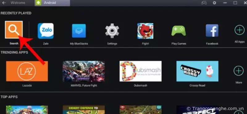 Bước 1: Sau khi cài đặt BlueStacks thành công, các bạn khởi động giả lập này lên và chạm vào Search.