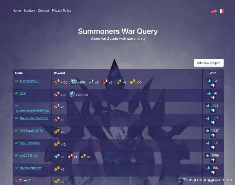 Đây là website chia sẻ mã Coupon uy tín nhất tại thời điểm hiện tại do cộng đồng Summoners War thế giới cùng chia sẻ