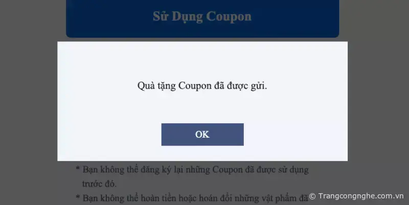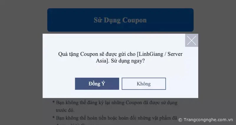 Sau khi nhập hoàn tất bạn có thể bấm nút "Sử Dụng Coupon" và hiển thị thêm thông báo, chọn "Đồng ý"