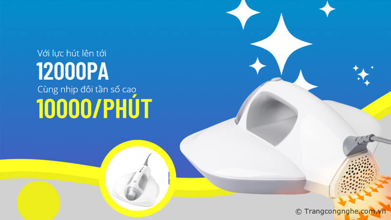 Với lực hút lên tới 12.000Pa cực kỳ mạnh mẽ cùng nhịp đôi tần số cao 10.000/phút, máy giúp bạn loại bỏ bụi bẩn và vi khuẩn nhanh chóng, triệt để hơn, đặc biệt là hạt bụi nằm sâu dưới lớp đệm hay sofa. Máy sử dụng khí nóng 50 độ C cùng bộ lọc 4 lưới (lốc xoáy, kim loại, HEPA F8, bọt biển) loại bỏ hoàn toàn mạt và tác nhân gây mùi ẩm mốc.