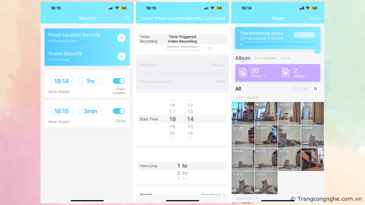 Ngoài ra, chúng ta có thể thiết lập tính năng đi tuần tra và theo dõi chuyển động ngay trên ứng dụng. Nếu phát hiện chuyển động bất thường, EBO SE sẽ gửi thông báo đến điện thoại để kịp thời phát hiện nếu có bất kỳ sự xâm nhập bất hợp pháp nào. Người dùng cũng có thể cài đặt thời gian cho robot tự động chơi đùa với thú cưng và xem lại các hình ảnh/video được ghi lại từ EBO SE trong phần album.