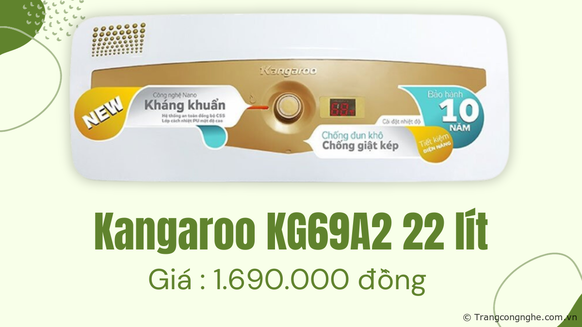 Những ưu điểm có thể kể đến của bình nóng lạnh Kangaroo KG69A2 22 lít là khả năng chống giật kép, chống đun khô thông minh. Công nghệ Nano kháng khuẩn cung cấp nguồn nước sạch cùng hệ thống an toàn đồng bộ CSS cũng giúp người dùng yên tâm hơn trong quá trình sử dụng.