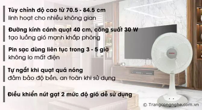 Một tính năng đặc biệt của quạt tích điện là khả năng quay đảo chiều, giúp phân phối không khí mát một cách đều trên không gian rộng. Việc quạt quay đảo chiều giúp tránh tình trạng tập trung gió vào một vị trí cố định, từ đó giảm nguy cơ cảm lạnh và ảnh hưởng đến hệ hô hấp của người già và trẻ nhỏ.