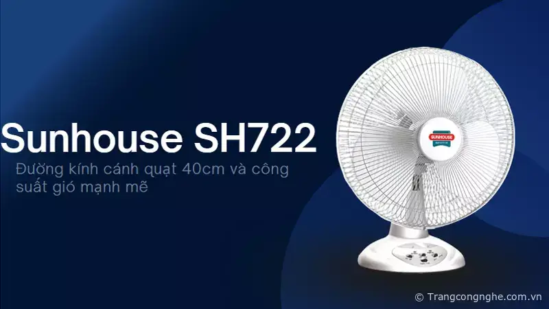 Quạt Sunhouse SH722 có đường kính cánh quạt 40cm và công suất gió mạnh mẽ, giúp tạo ra luồng không khí mát mẻ và lan tỏa đều trong không gian.