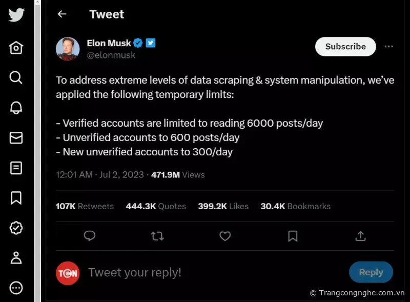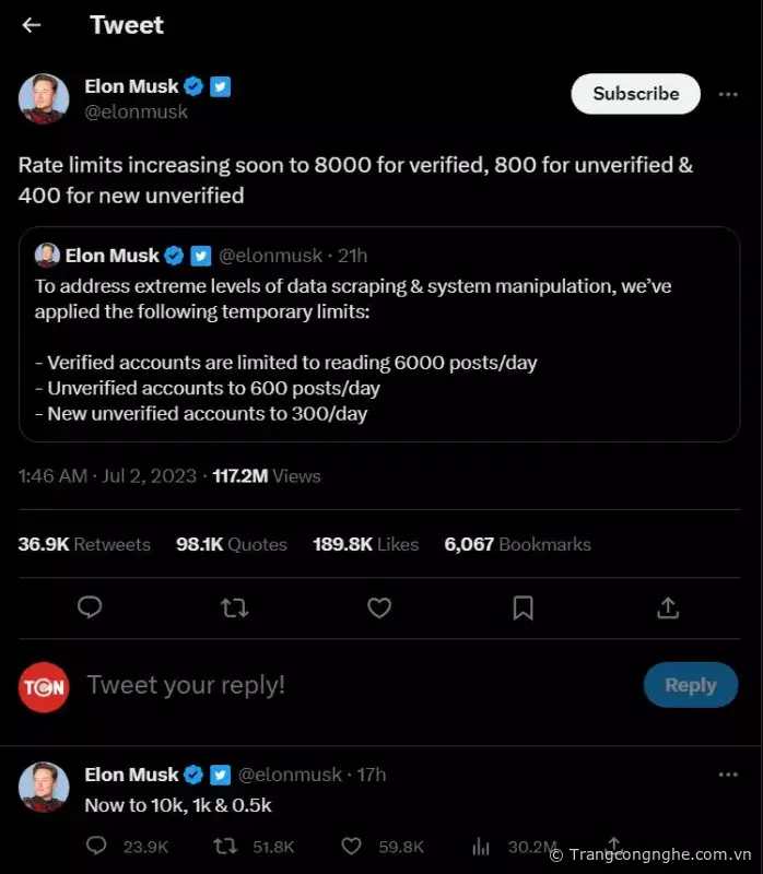 Ông chủ Twitter, tỷ phú Elon Musk đã thông báo rằng Twitter đang áp dụng các giới hạn tạm thời đối với số lượng bài đăng mà người dùng có thể đọc hàng ngày. Twitter đang thực hiện bước này để giải quyết “mức độ cực đoan” của việc thu thập dữ liệu và “thao túng hệ thống”.
