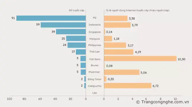 Sự cố cáp quang tác động đến các nước đang khai thác, nhưng Việt Nam bị ảnh hưởng nặng do số cáp ít, tỷ lệ người dùng trên mỗi tuyến cáp cao. Đồ họa: Hoàng Khánh
