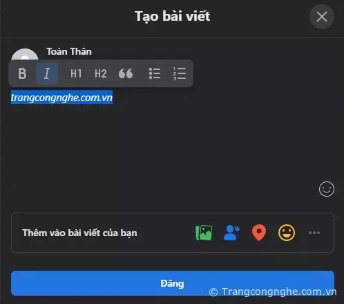 Để viết chữ nghiêng trên Facebook, bạn chỉ cần bôi đen đoạn văn bản mà bạn muốn viết nghiêng và nhấn vào biểu tượng "I" ở thanh công cụ. Đoạn văn bản sẽ được viết nghiêng ngay lập tức.