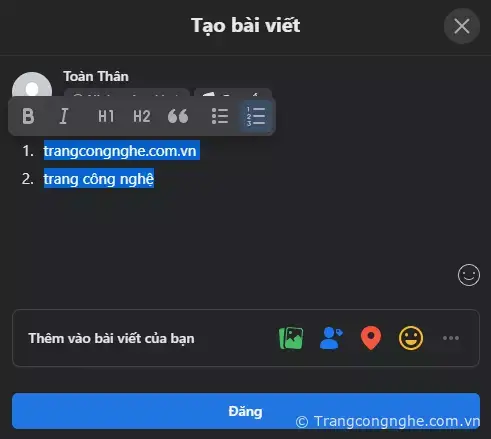 Để viết số thứ tự trên Facebook, bạn chỉ cần bôi đen đoạn văn bản mà bạn muốn viết số thứ tự và nhấn vào biểu tượng "1.", "2.", "3.", v.v. Đoạn văn bản sẽ được viết thành số thứ tự ngay lập tức.