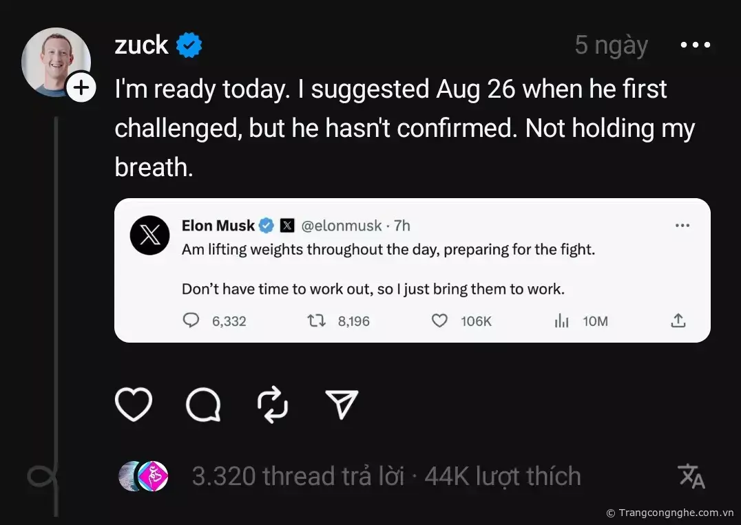 Về phía Mark Zuckerberg, CEO của Meta đang rất háo hức và đã sẵn sàng cho trận đấu này. Ông cũng chia sẻ dòng trạng thái trên Threads kèm ảnh chụp màn hình thông báo của Elon Musk với nội dung được tạm dịch: "Tôi đã sẵn sàng cho trận đấu vào ngày 26/8, tôi không thể chờ đợi hơn được nữa".
