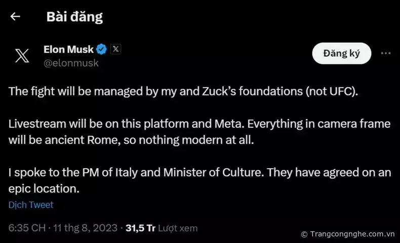 Elon Musk đã đăng tải thông báo chính thức về trận đấu này: "Cuộc so tài sẽ được quản lý và tổ chức bởi tôi - Elon Musk và Zuck (không phải UFC). Trận đấu sẽ được livestream trên X và các nền tảng mạng xã hội của Meta. Khung cảnh xung quanh là thành phố Roma cổ đại".