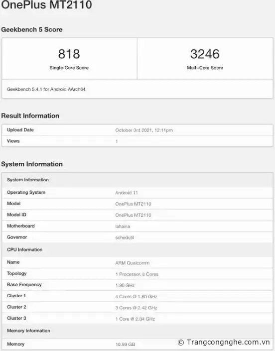 Chưa hết, Geebench cũng xác nhận OnePlus 9RT sẽ có RAM 12 GB, chạy Android 11, máy đạt 818 điểm hiệu năng đơn lõi và 3.246 điểm hiệu năng đa lõi.