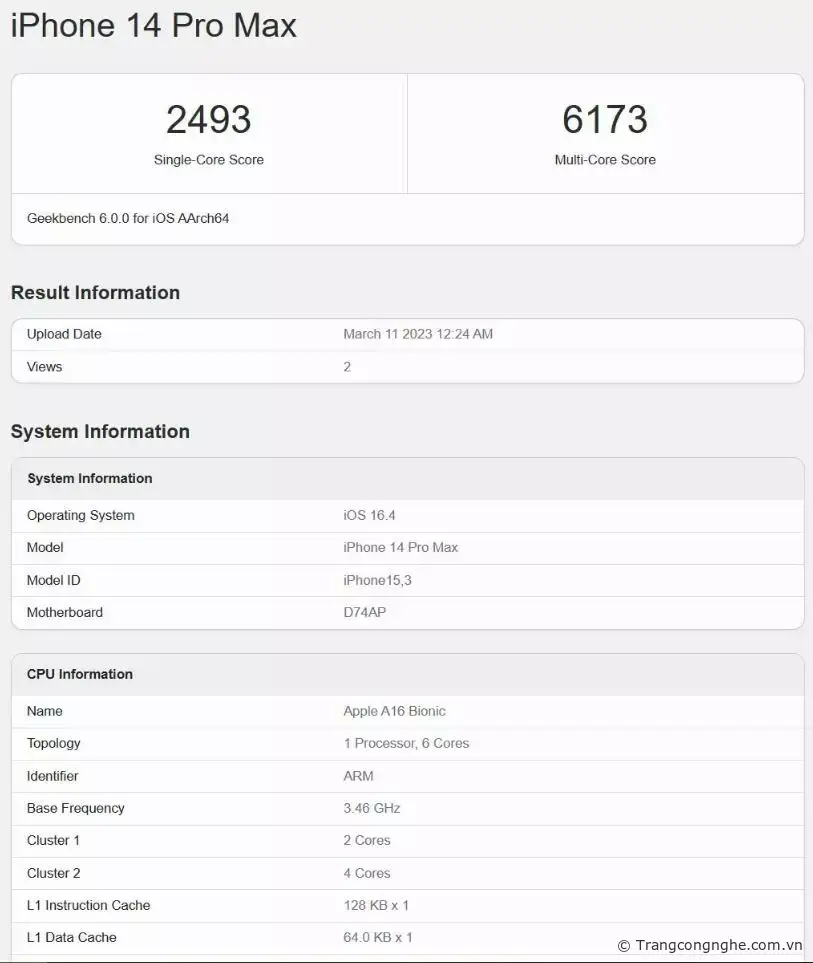 Tài khoản @NaveenTechWala hôm nay chia sẻ trên X cho thấy bài kiểm tra được thực hiện trên iPhone 15 Pro, các tin đồn về thông số kỹ thuật trước đó cho biết A17 Bionic sẽ tiếp tục có CPU 6 nhân giống như A16 Bionic và kết quả Geekbench 6 cho thấy tốc độ xung nhịp 3,70 GHz, giúp A17 Bionic trở thành chip di động mạnh nhất thế giới vào thời điểm được ra mắt.
