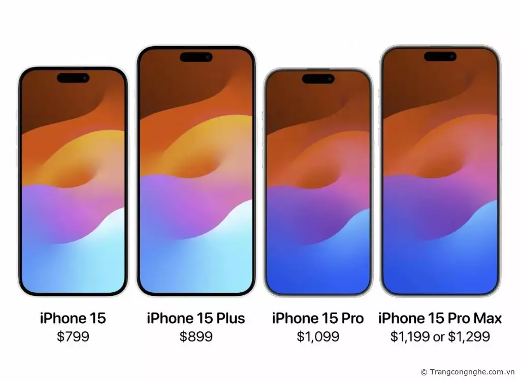 Bộ đôi iPhone 15 Pro và 15 Pro Max sẽ có giá tăng thêm 100 USD so với bộ đôi iPhone 14 Pro và 14 Pro Max, nguyên do bắt nguồn từ giá chip A17 cao hơn trước. Trong đó, iPhone 15 Pro có giá khởi điểm 1.099 USD và iPhone 15 Pro Max có giá khởi điểm 1.199 USD hoặc 1.299 USD.