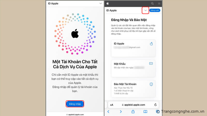Bước 2: Sau khi đăng nhập, bạn sẽ thấy biểu tượng mũi tên xuống gần tên tài khoản Apple ID ở phía trên cùng bên phải của trang. Nhấn vào biểu tượng mũi tên để mở danh sách các tùy chọn tài khoản.