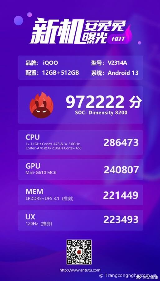 iQOO Z8 xuất hiện trên AnTuTu, xác nhận dùng Dimension 8200