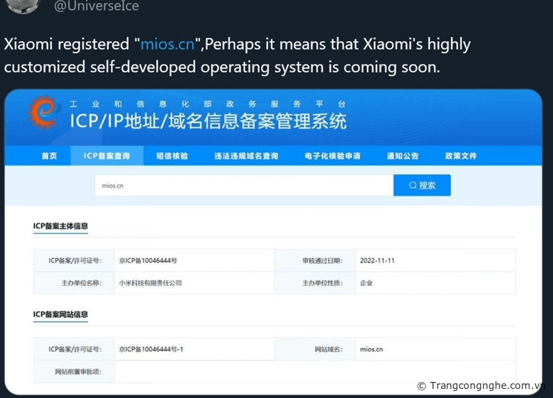 Có tin đồn rằng Xiaomi đang phát triển một hệ điều hành riêng, có tên là MiOS. Thông tin này được củng cố khi leaker Ice Universe tiết lộ rằng Xiaomi đã đăng ký tên miền "mios.cn". Tuy nhiên, chúng ta cần chờ đợi thông tin chính thức từ Xiaomi để xác nhận về việc phát triển hệ điều hành này và những chi tiết liên quan.