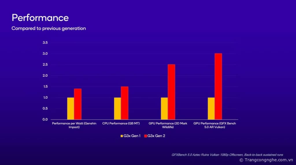 Qualcomm cho biết hiệu suất CPU của G3x Gen 2 nhanh hơn 30% so với phiên bản tiền nhiệm, trong khi hiệu suất GPU sẽ nhanh gấp đôi. G3x Gen 2 có khả năng cung cấp sức mạnh cho các thiết bị console với khả năng chơi game đa nền tảng, cũng như các thiết bị được sử dụng để chơi game trên Android, PC, Cloud.