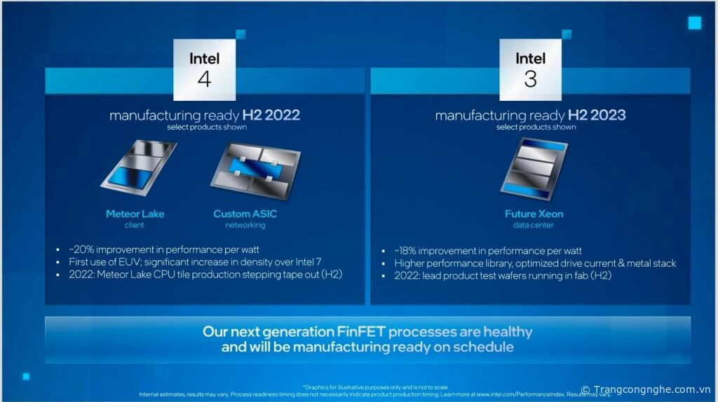 Intel bày tỏ sự tin tưởng vào quy trình "Intel 4" sẽ được sử dụng trong các CPU Meteor Lake sắp ra mắt vào tháng 9. Intel 4 (hay tiến tình 7nm) được kỳ vọng sẽ cải thiện 20% mức hiệu năng/watt so với Intel 7, và đây cũng là dây chuyền đầu tiên sử dụng công nghệ Extreme Ultraviolet (EUV) được Intel đưa vào sử dụng.