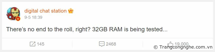 Tài khoản leaker nổi tiếng @Digital Chat Station cho biết trong một bài đăng trên weibo rằng RAM 32GB đã được thử nghiệm trên điện thoại thông minh. Mặc dù leaker này không tiết lộ tên thương hiệu nào, tuy nhiên dựa theo các xu hướng mới nhất có thể là realme, OnePlus hoặc ZTE nubia. Bởi các nhà sản xuất này đã tung ra những mẫu điện thoại của riêng mình có RAM 24GB, trong đó Red Magic 8S Pro là sản phẩm đầu tiên tung ra cấu hình này. OnePlus Ace 2 Pro và Realme GT 5 cũng có RAM cực lớn.
