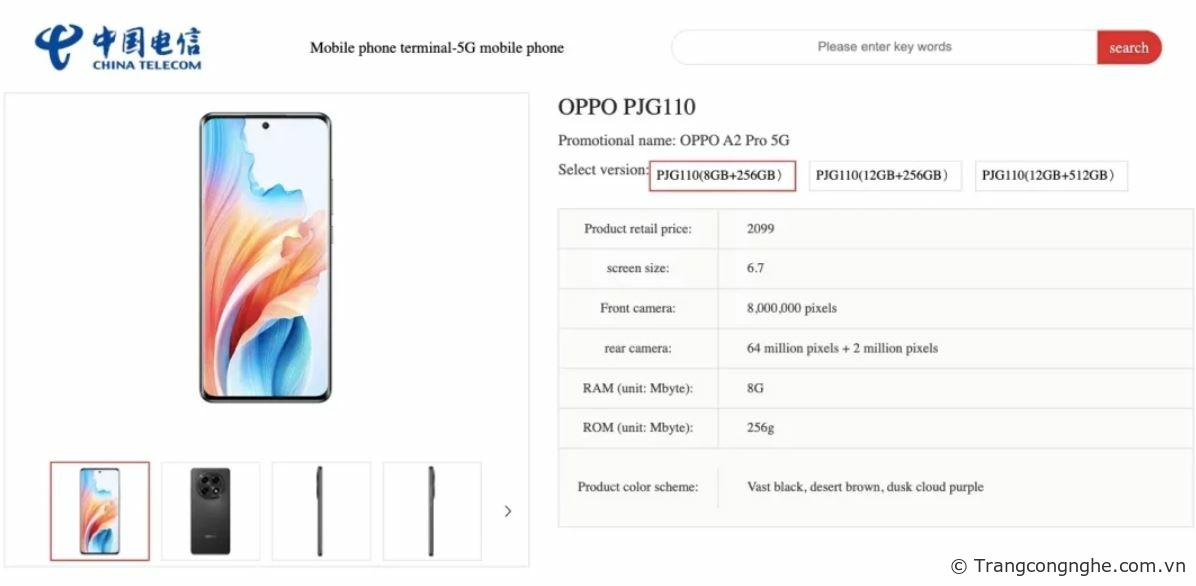 Cuối tuần trước, OPPO A2 Pro 5G được phát hiện trên trang cơ sở dữ liệu của China Telecom. Theo thông tin mô tả, A2 Pro 5G sẽ có màn hình 6.7 inch với độ phân giải Full-HD+, màn hình được thiết kế cong tràn cạnh 2 bên, cùng thiết kế đục lỗ để chứa camera selfie.