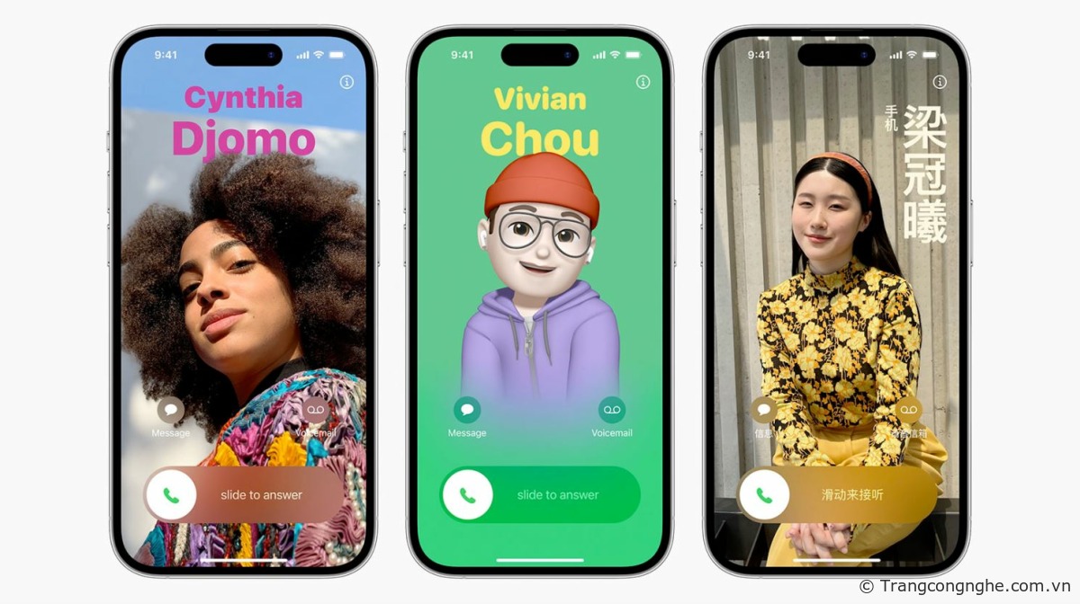 Contact Poster: Trên iOS 17, Apple đã ra mắt tính năng mới gọi là "Contact Poster," mang đến một trải nghiệm gọi điện hoàn toàn mới. Theo đó, ứng dụng này kế thừa thiết kế từ màn hình khoá, cho phép người dùng tùy chỉnh các chi tiết khác nhau, từ tên gọi đến hình nền cuộc gọi. Người dùng có khả năng lựa chọn hình nền từ bộ sưu tập ảnh của họ hoặc từ hình ảnh của người thân và bạn bè. Tên người gọi cũng có thể được biến đổi với font chữ lớn và khả năng tuỳ chỉnh màu sắc theo nhiều cách khác nhau.